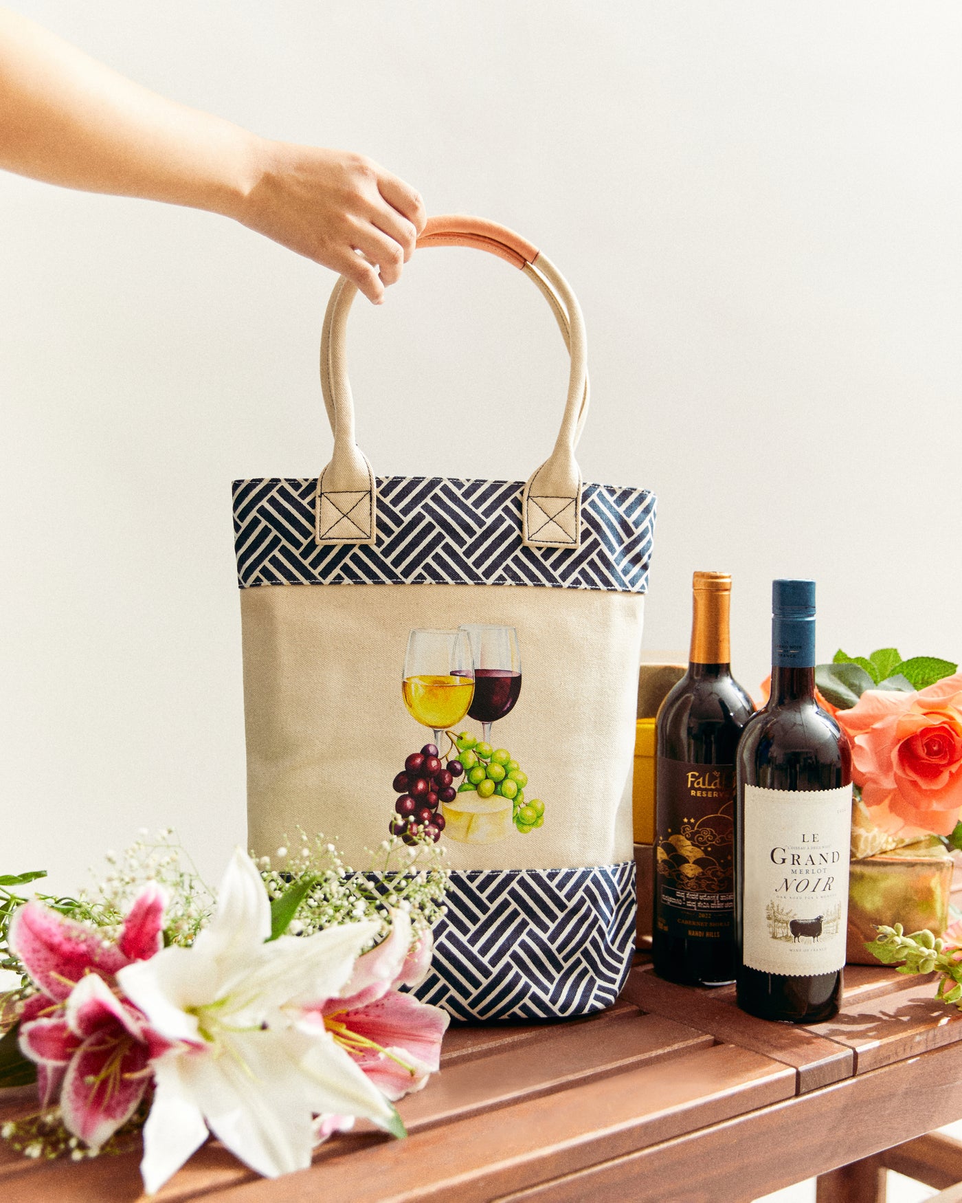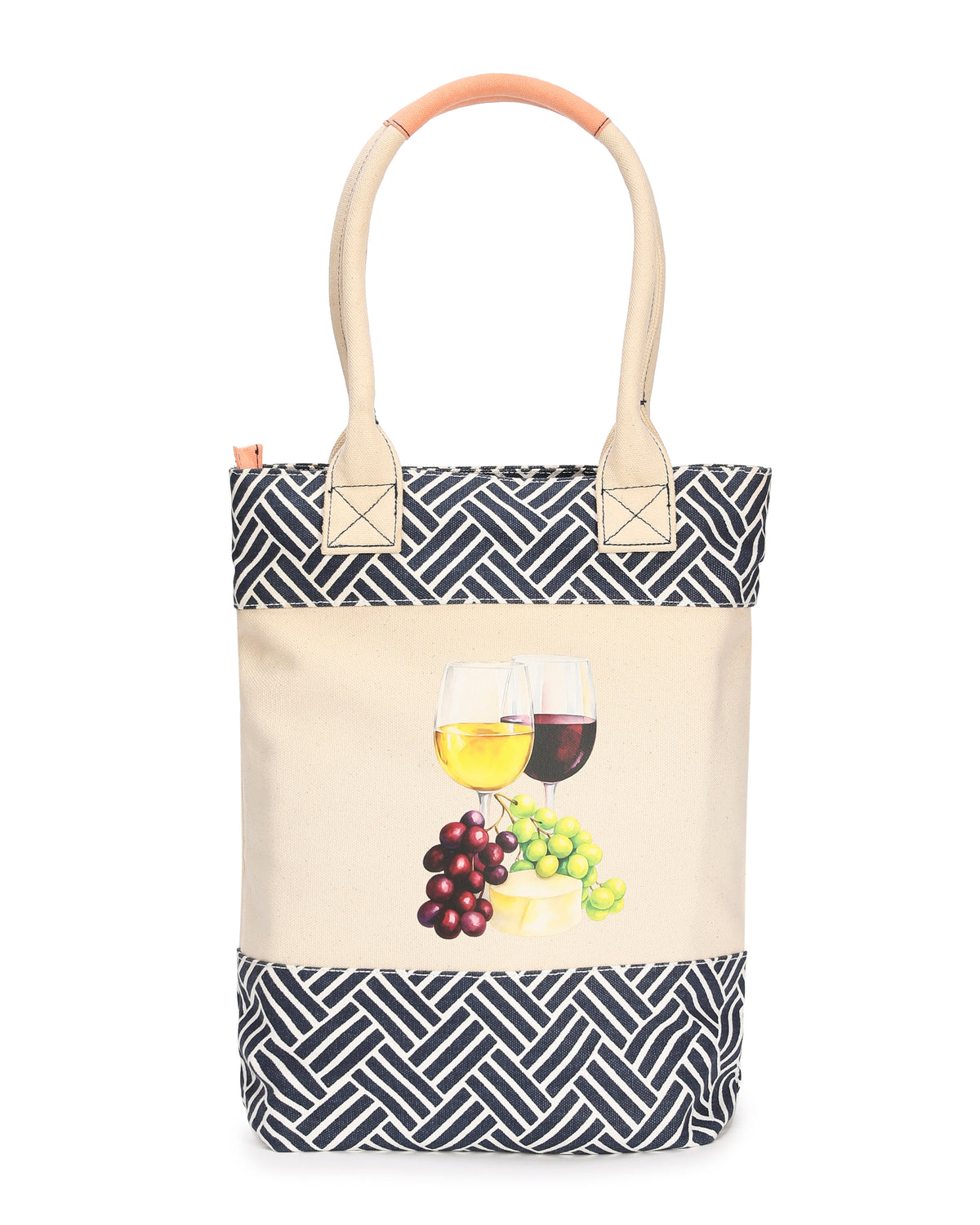 Crafted in durable cotton canvas with a geometric navy border and soft and sturdy handles, the prints celebrate the joy of wine — featuring vibrant motifs of red and white glasses and grape clusters.